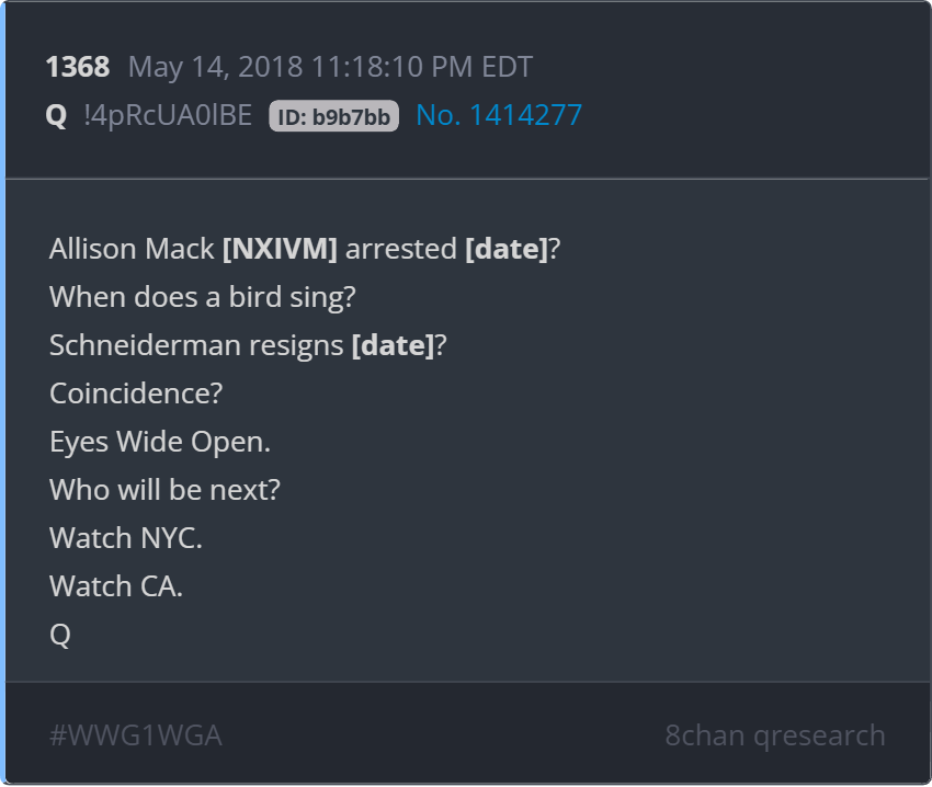 Times Union 紙の 2018年3月27日付記事によれば、シュナイダーマンの NY 州司法長官事務所は、NXIVM に関連する非営利財団について捜査を行っていた。シュナイダーマンが辞任を発表した2018年5月7日は、アリソン・マックが逮捕された2018年4月20日のわずか17日後である。「Q」は、マックの逮捕・自供がシュナイダーマンの辞任につながった、と示唆している訳だ。