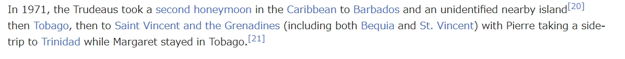 実は、ピエールとマーガレットのトルドー夫妻は、1971年4月中旬に、「2度目のハネムーン」でカリブ海の島々を訪れているのだ。このとき二人は、「バルバドスおよび名前が挙げられていない近くの島、トバゴ、セントビンセントおよびグレナディーン諸島(ベキアとセントビンセントの両方を含む)を訪れ、ピエールはトリニダードに寄り道し、マーガレットはトバゴに滞在した。」