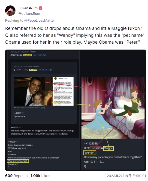 バラク・オバマ(本名バリー・ソエトロ)は、自身をピーター・パンになぞらえ、少女マギー・ニクソンを「ウェンディ」という愛称(pet name)で呼んで、ロールプレイしているのではないか? Qとトランプが、投稿の中で「Wendy(ウェンディ)」という名に焦点を当てて伝えたかったのは、そのことではないか?