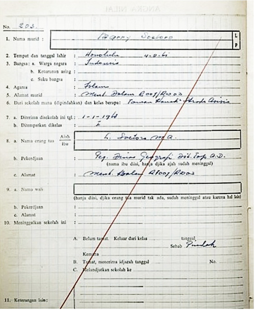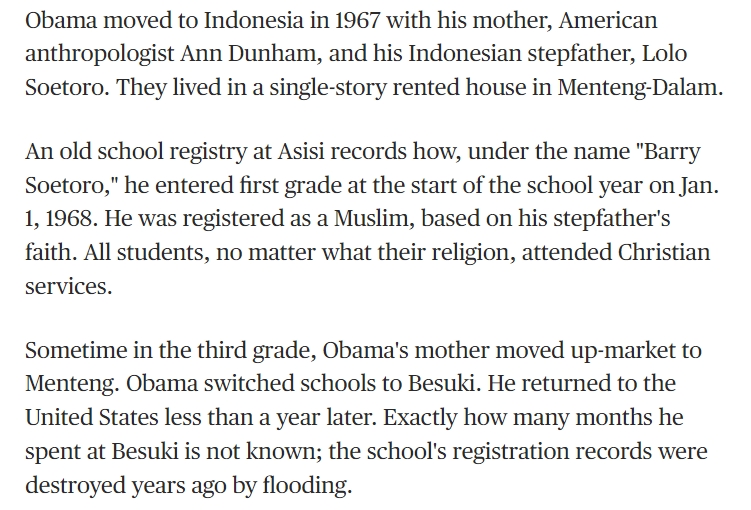バラク・オバマが、インドネシアで1968年から [1970年まで] 通った小学校(St Francis Assisi Catholic elementary school)の記録によると、彼は「Barry Soetoro(バリー・ソエトロ)」という氏名で入学している。「イスラム教徒(Muslim)」として登録されている。