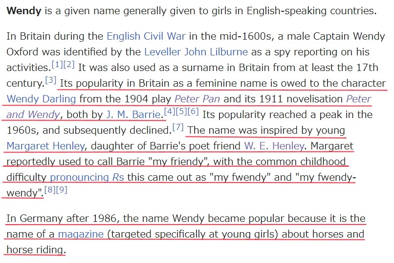 Wendy(ウェンディ)という名前から連想されるのは、劇作家ジェームス・マシュー・バリー(J. M. Barrie)作の戯曲(童話)『ピーター・パン』だ。この童話に登場する少女の名が「Wendy(ウェンディ)」である。類似の小説『ピーター・パンとウェンディ』が、ディズニー社によってアニメーション映画化されている。